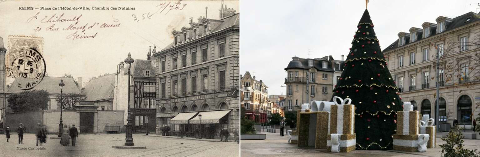 Sur la droite, entre la rue de Tambour et la rue Colbert on voit bien le grand Café de la Mairie, un établissement apprécié des Rémois pour son emplacement idéal et son ambiance qui n’existe plus,