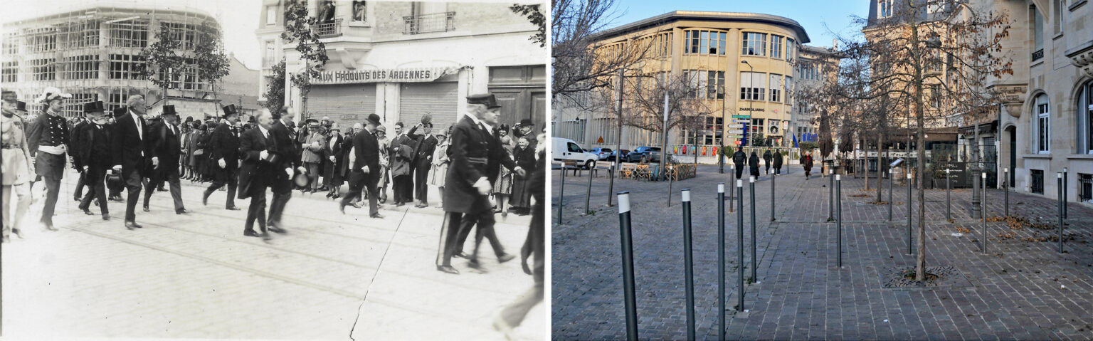 Le président Doumergue accompagné par Paul Marchandeau, maire de Reims. Le cortège se dirige vers la bibliothèque Carnegie pour son inauguration.