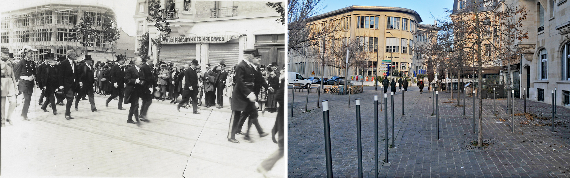 En juin 1935, Reims accueille le président de la République Albert Lebrun à l’occasion d’une visite officielle qui s’inscrit dans le contexte de la France de l’entre-deux-guerres. Cette venue présidentielle revêt une forte portée symbolique pour la ville, encore profondément marquée par les destructions de la Première Guerre mondiale mais engagée dans un vaste mouvement de reconstruction et de modernisation. On voit bien sur la photographie l’arrière de la Poste Cérès en construction.