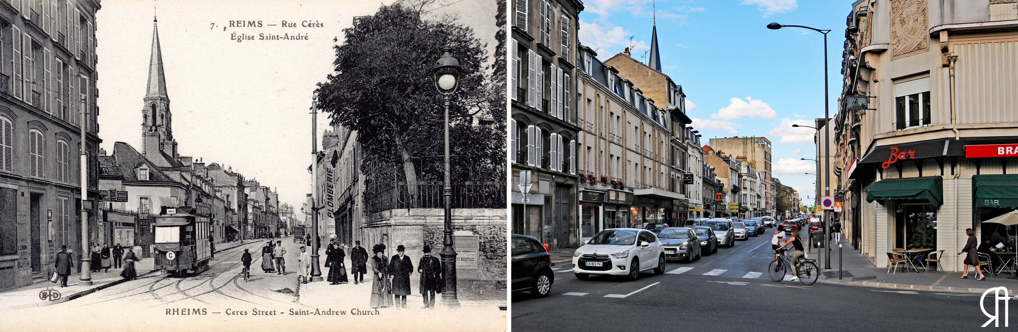 En quittant la place Aristide Briand, on prend l’avenue Jean-Jaurès, une des plus longues voies de Reims : 1700 mètres de longueur. A gauche, l’église Saint-André