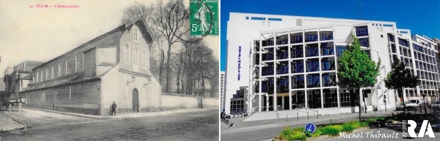 L’arrivée du Chemin de Fer le 4 juin 1854, avait entraîné la disparition du « Trianon », fondé par Jean-Baptiste Chemin (1814-1903). Un nouvel établissement est ouvert en 1955, par J.B. Chemin, 48 boulevard du Chemin de Fer (actuel boulevard Roederer près du chemin de Clairmarais (actuelle rue de saint-Brice) sous la dénomination L’Embarcadère, le non à l’époque de la gare en toile. La gare définitive date de 1860. Le terme Embarcadère sera aussi valable pour le C.B.R. (chemin de Fer de la Banlieue de Reims) où on embarquait boulevard Roederer.