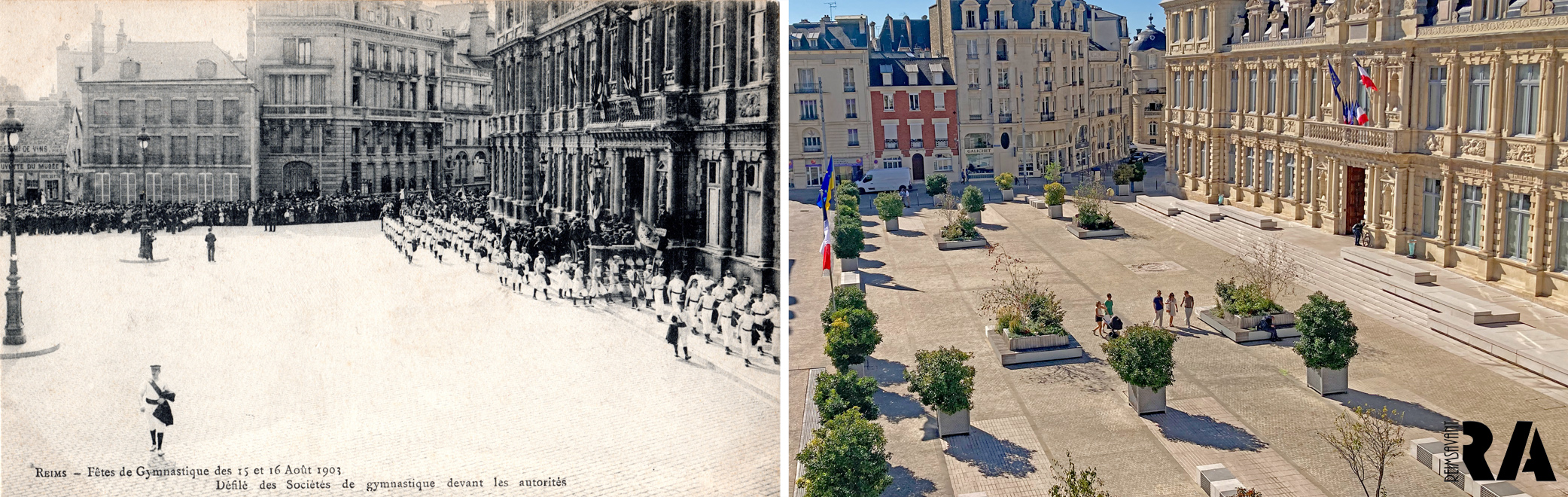 Le parvis de l’hôtel de ville accueille depuis le 19ème siècle des défilés de sociétés sportives. Ce fut le cas à l’occasion des grandes fêtes fédérales de gymnastique organisées à Reims en 1876 et 1882. Les 15 et 16 août 1903, un concours international de gymnastique se déroule à Reims. 45 sociétés, dont les 8 rémoises, sont présentes, constituant un cortège d’environ mille gymnastes qui prend son départ du square Colbert et converge vers l’hôtel de ville où la municipalité reçoit les représentants des différentes sociétés.