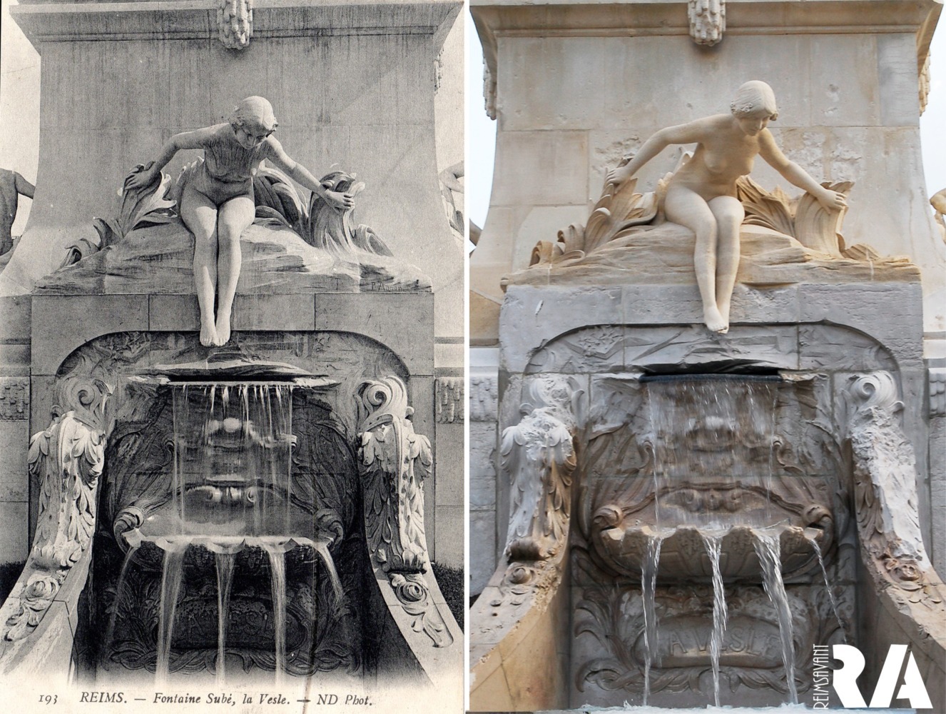 En 1918, Reims est à terre. Plus de 60 % de ses constructions sont détruites. La place d’Erlon n’est plus qu’un amas de ruines sauf le monument imaginé par André Narjoux ! « Les statues sont abimées, certaines ont disparues, comme celle de la Vesle, mais l’ensemble est debout. Elle devient un symbole. »