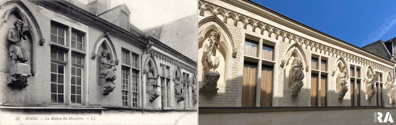 …Plus d’un siècle après sa disparition, la façade de la plus belle maison médiévale de Reims s’élève à nouveau rue de Tambour. La conservation d’une grande partie de son décor sculpté, déposé en 1917 avant le pilonnage ultime de cette ville du front, ainsi que la très abondante documentation, permettent d’engager sa restitution avec le concours de mécènes, sous l’œil vigilant des services compétents de l’État. Sa particularité est de présenter un rare ensemble de statuaire laïque de grande dimension, quatre musiciens encadrant un « auditeur » qui tenait un faucon sur le poing…. Voir la suite, par Patrick Demouy Professeur émérite d’histoire médiévale à l’Université de Reims : Maison des musiciens