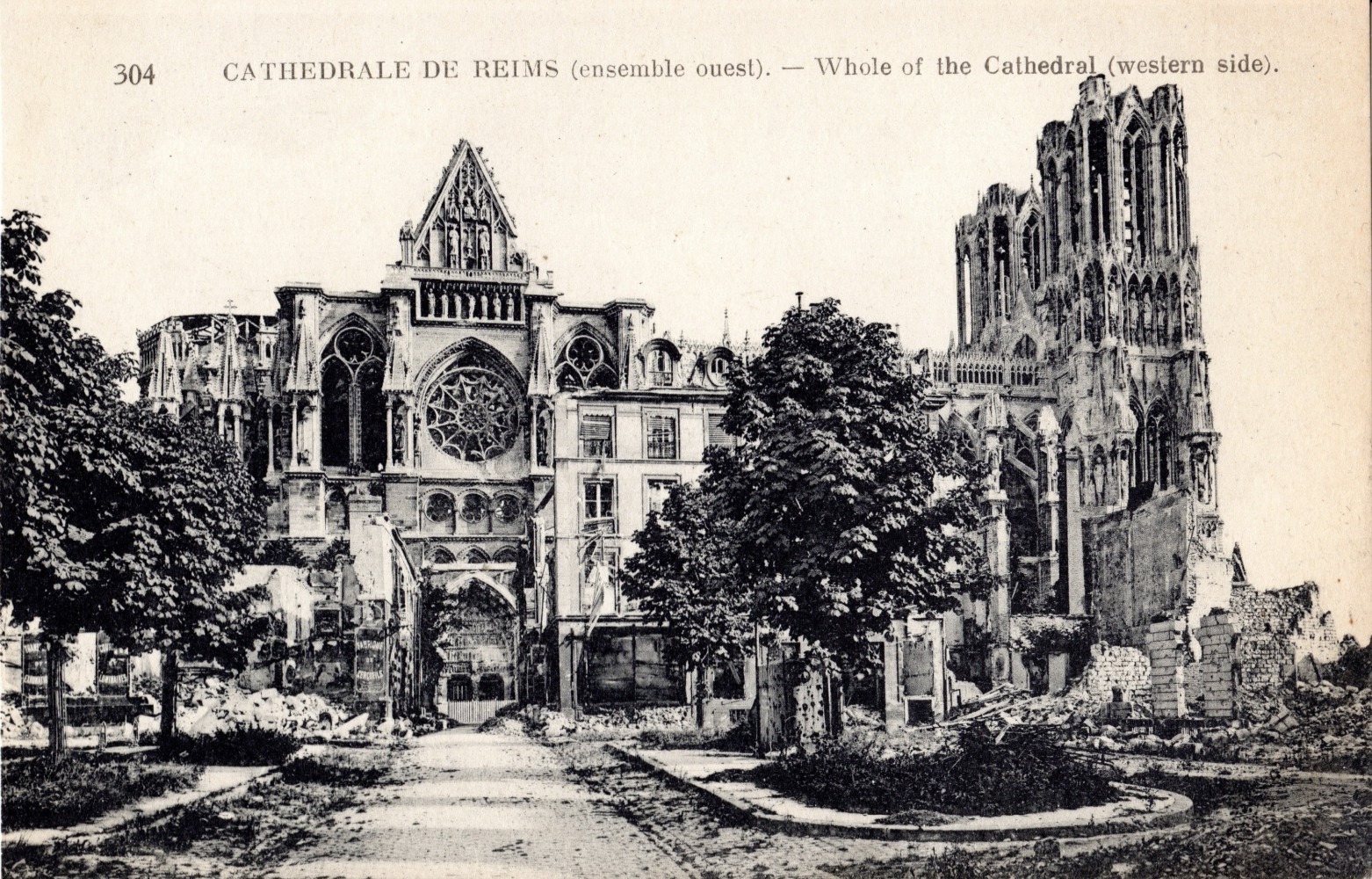 La carte postale suivante date des années 1914-1915, la toiture de la cathédrale n’existe plus, elle a brûlé le 19 septembre 1914, par contre les maisons de la place ne seront détruites que plus tard.