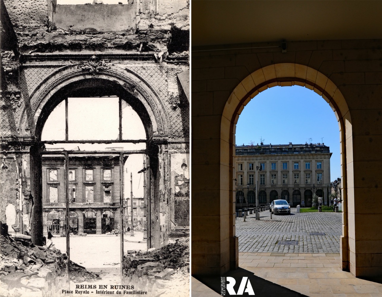 Lors de l’élargissement des rues Carnot et Cérès, après 1918, les arcades jouxtant la place Royale ont été aménagées en passages publics. la décoration que l’on observe sur la photo ancienne est donc celle de l’ancien intérieur de l’immeuble.