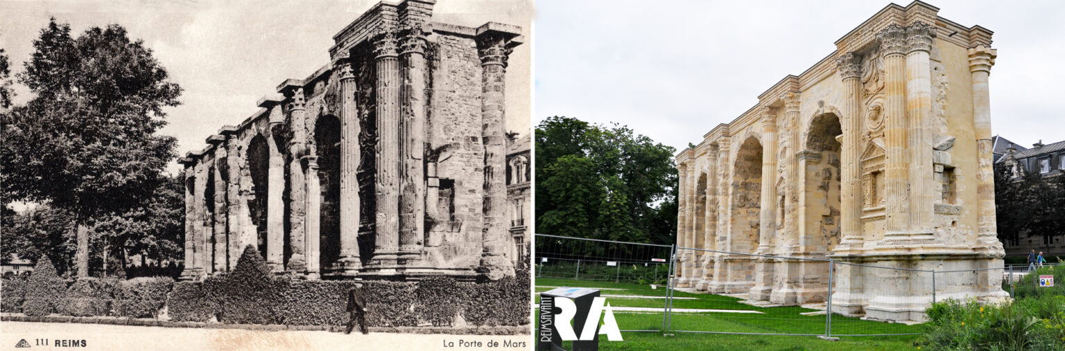 Ci-dessous, la porte de Mars en 1912 avec une voie vers la place de la République et la fameuse fontaine Bartholdi disparue en 14-18. Ces deux photographies actuelles ont été prises du boulevard Desaubeau