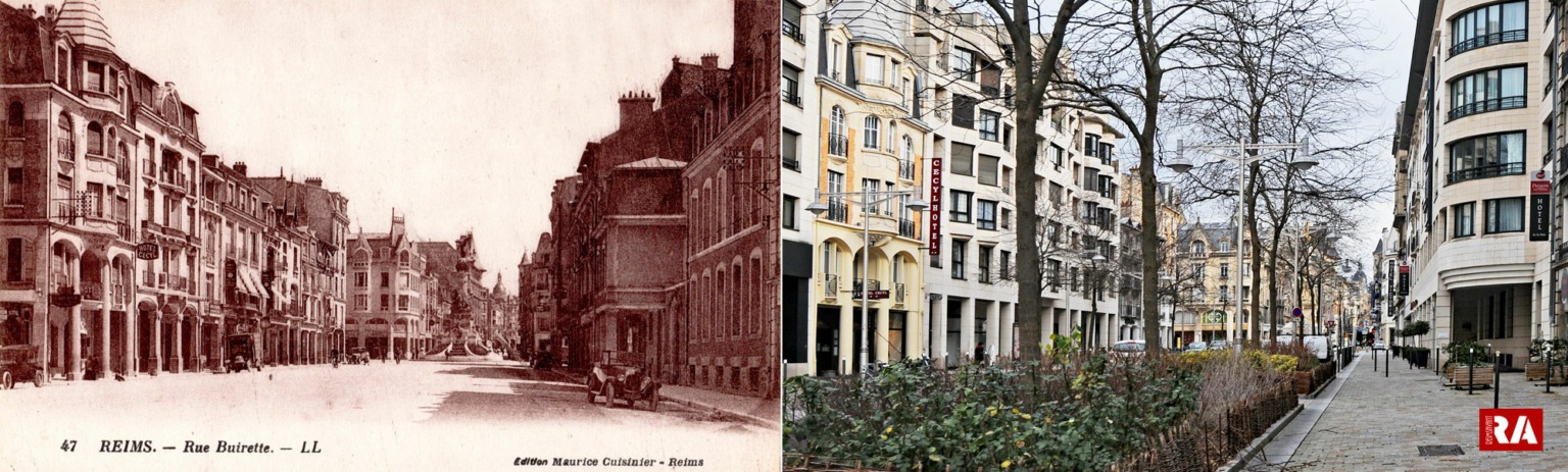Le plus ancien théâtre de Reims était rue Buirette, au coin de la rue Caqué, construit en 1755, par Regnault, dans le local du Jeu de Paume. En 1790, Draveny, propriétaire d’un terrain situé vers le milieu de la rue Buirette (alors rue Large), élève une autre petite salle de spectacle revendue en 1832.