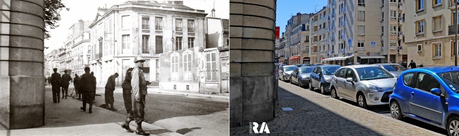 On aperçoit à gauche un mur de l’hôtel Ponsardin, actuelle Chambre de commerce. On peut voir les soldats américains et les prisonniers allemands