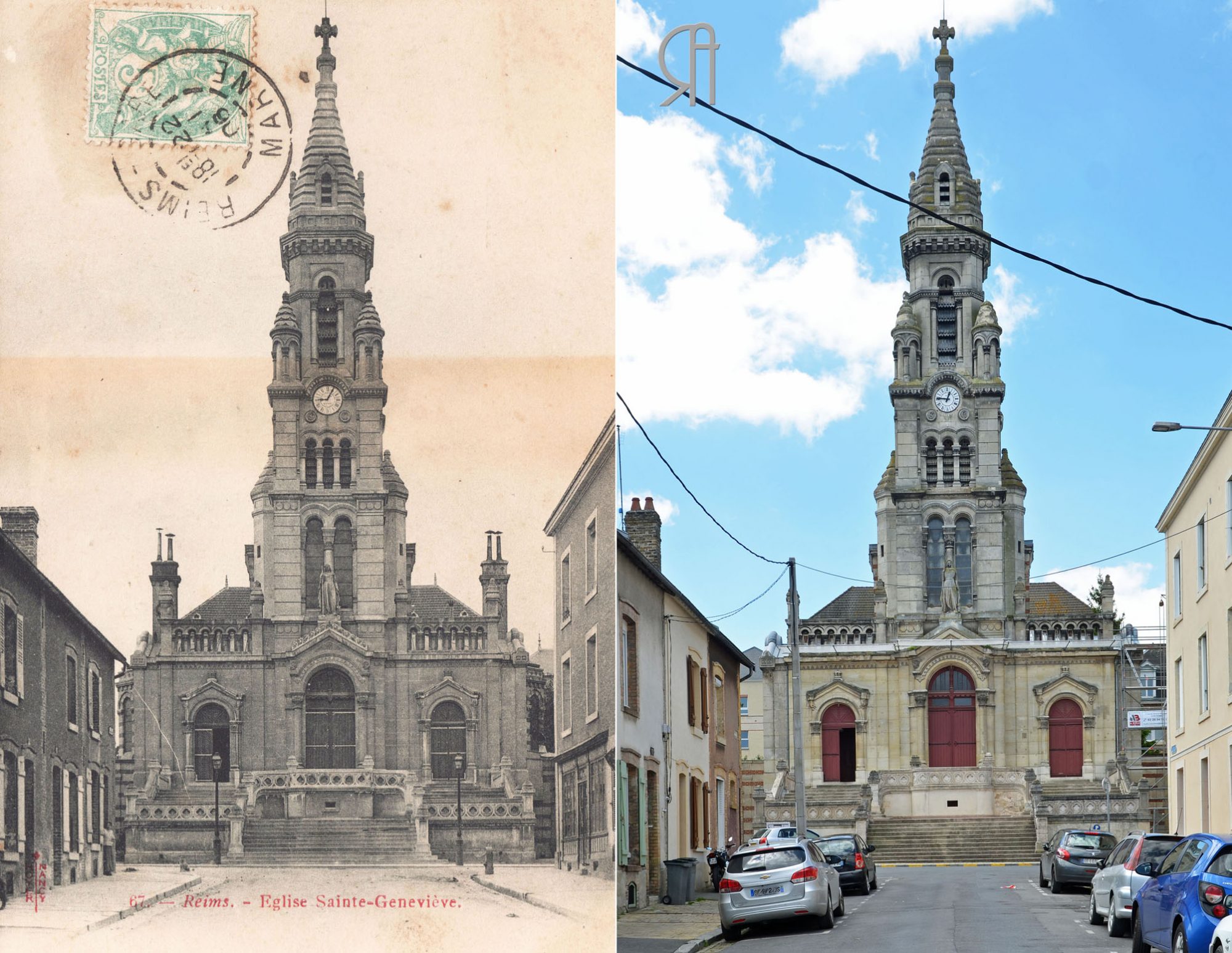 Cette église construite en 1878 par Narcisse Brunette (ancien architecte de la Ville). Financée par Madame Roederer-Boisseau, aidée de généreux donateurs, l’église fut érigée sur des terrains incultes. De style romano-byzantin, elle se caractérise par son escalier à double révolution et l’abondance de ses vitraux retraçant la vie de Sainte Geneviève et d’autres saints. Notez que la toiture de la flèche est en pierre comme le reste de l’édifice.