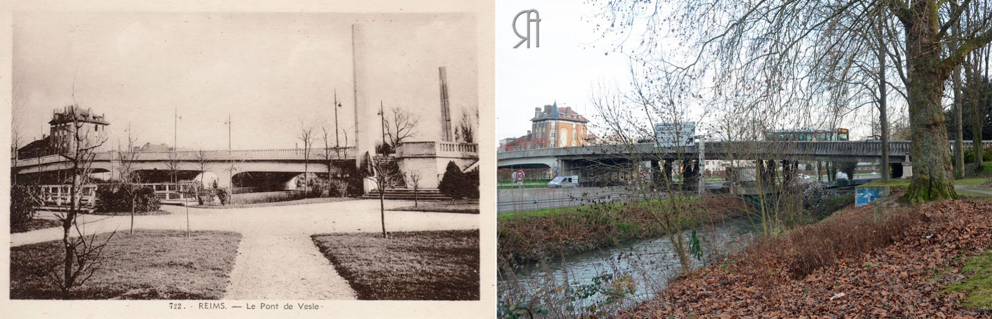La carte postale montre le pont de Vesle après son inauguration en juin 1935. A cette époque la traversée urbaine (ex A4) n’existe pas, à la place ce sont des jardins. La Vesle est en contre-bas et n’est pas visible directement, on aperçoit juste une petite passerelle en bois permettant la promenade pour aller sur le bord du canal.
