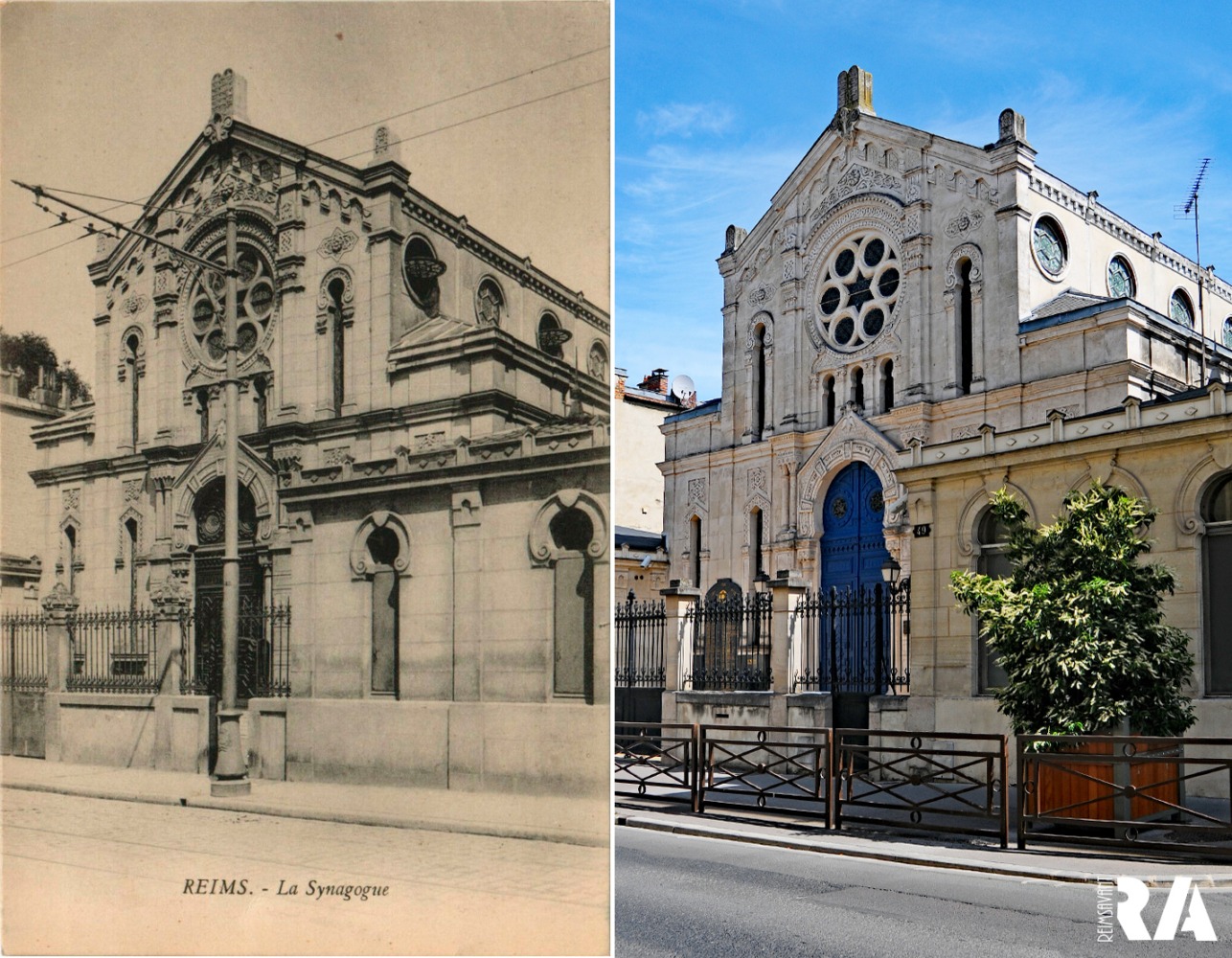 Située au 49 rue Clovis, la synagogue a été abimée mais pas détruite pendant la Grande Guerre, on remarque qu’on lui a ajouté une fenêtre, vers la droite, au moment de la Reconstruction.