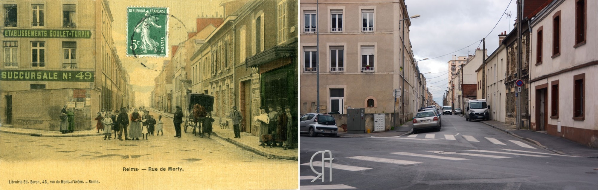 Ancienne rue de Merfy, [1894]. Cette voie, bien que dénommée officiellement en 1894, existait déjà sous ce nom en 1876. Elle fut débaptisée par ordre du gouvernement, en 1946, pour prendre le nom de rue Pierre-Brossolette.
